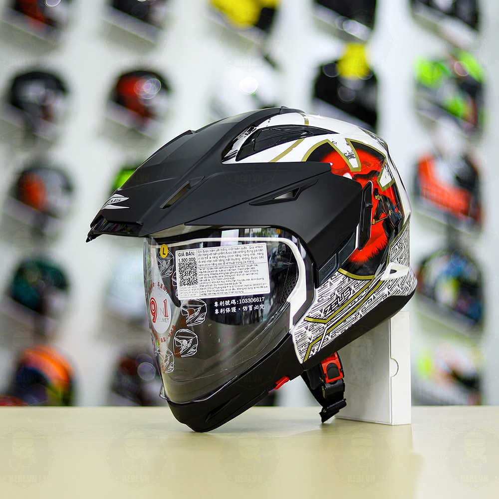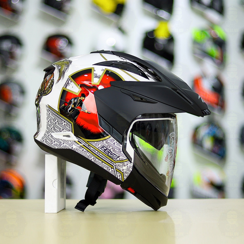 Full Bộ Mũ Zeus 613b + Mái Che + Hàm Samurai Trắng Đỏ Bóng