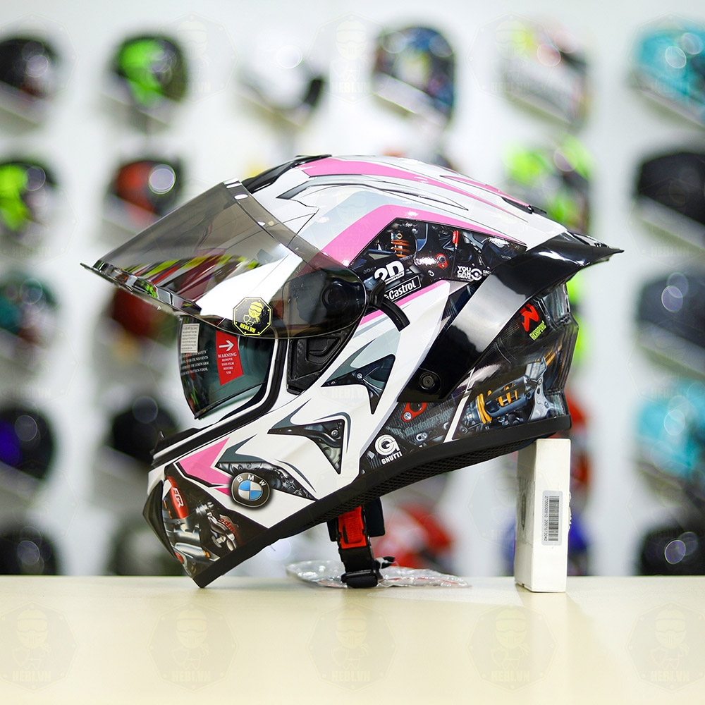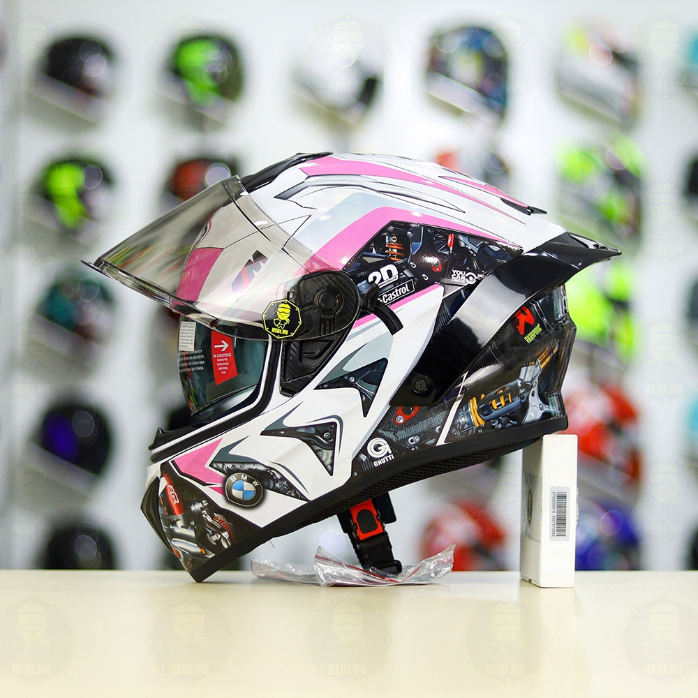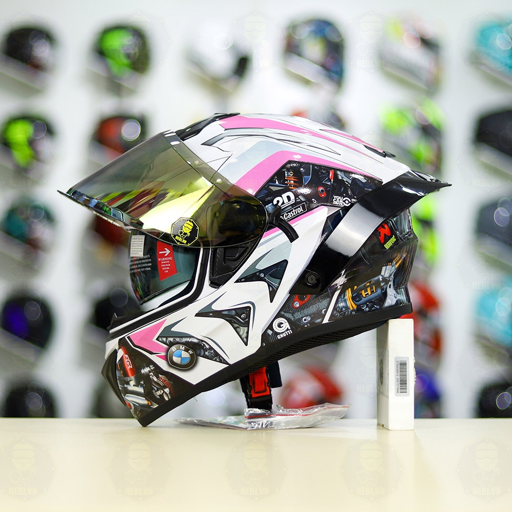 Mũ Fullface EGO E81 Trắng Bóng + Tem BMW Trắng Hồng FREESHIP