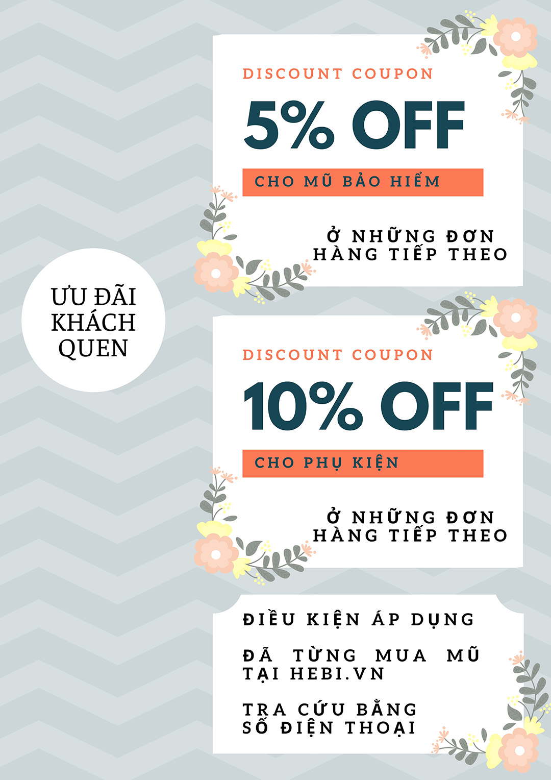 ĐẶC BIỆT: tặng phiếu ưu đãi 5% cho nón và 10% cho phụ kiện ở những đơn hàng tiếp theo: