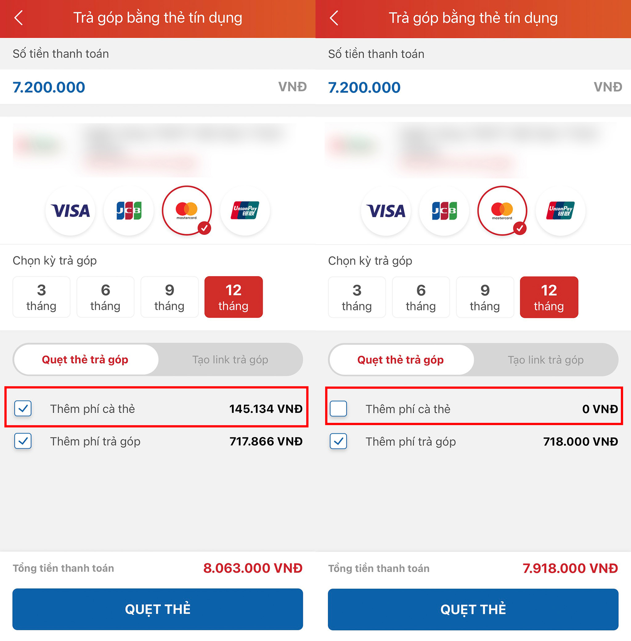 Ví dụ: Bạn mua nón LS2 FF900 màu đen nhám trị giá 7.200k và muốn trả góp qua thẻ tín dụng trong 12 tháng thì: