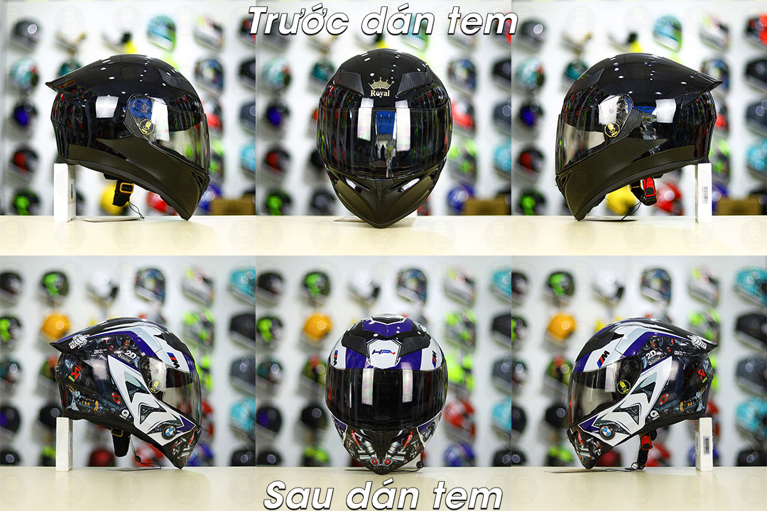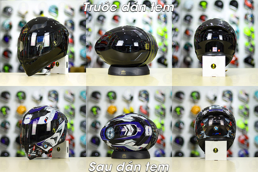 Mũ Royal M138b Đen Bóng + Dán Tem Decal BMW Trắng Xanh
