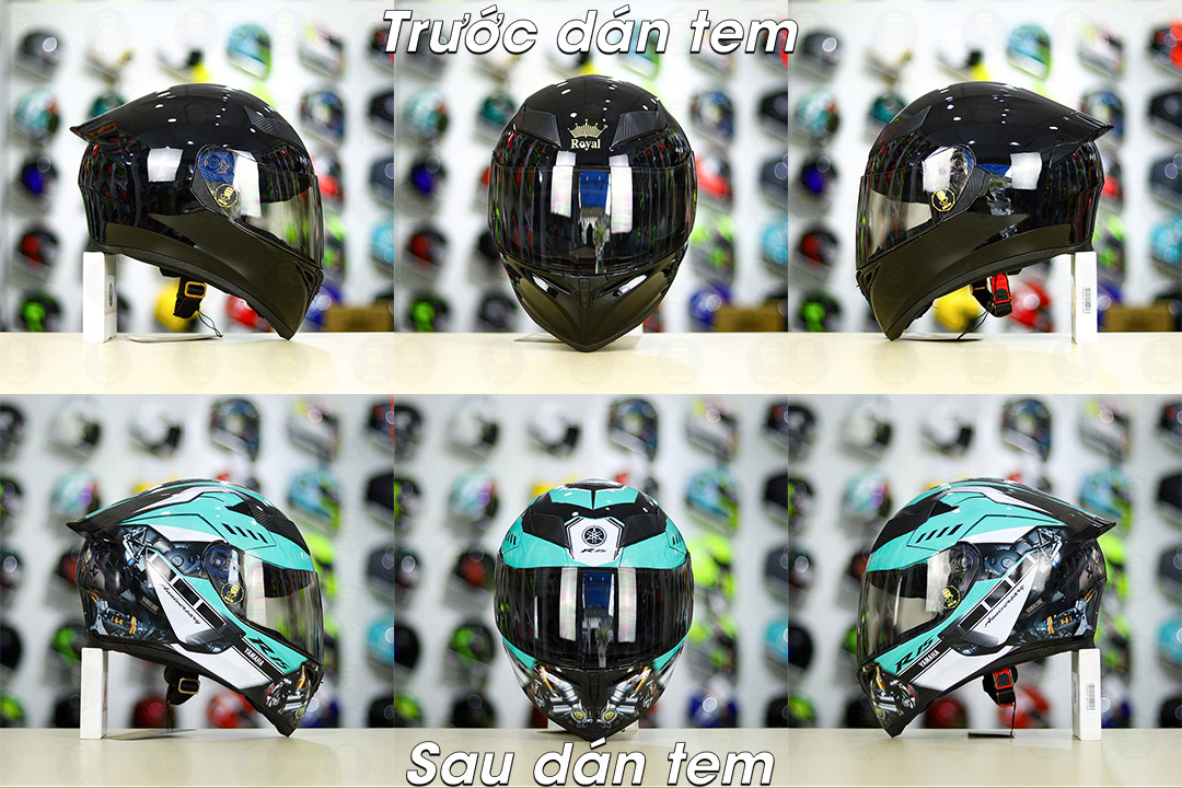 Mũ Royal M138b Đen Bóng + Dán Tem Decal Yamaha R15 Xanh Ngọc