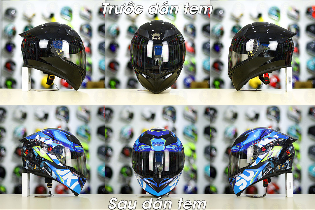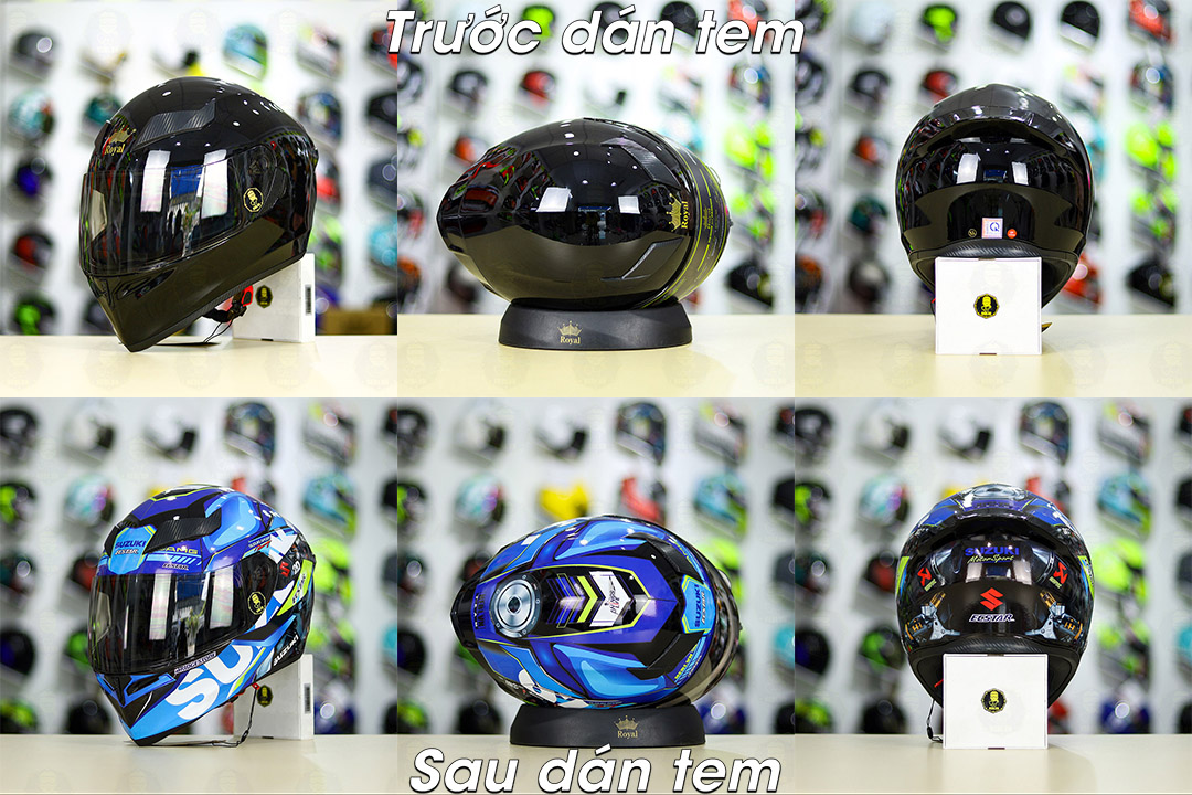 Mũ Royal M138b Đen Bóng + Tặng Tem Decal SUZUKI ECSTAR Xanh Trắng Vàng FREESHIP