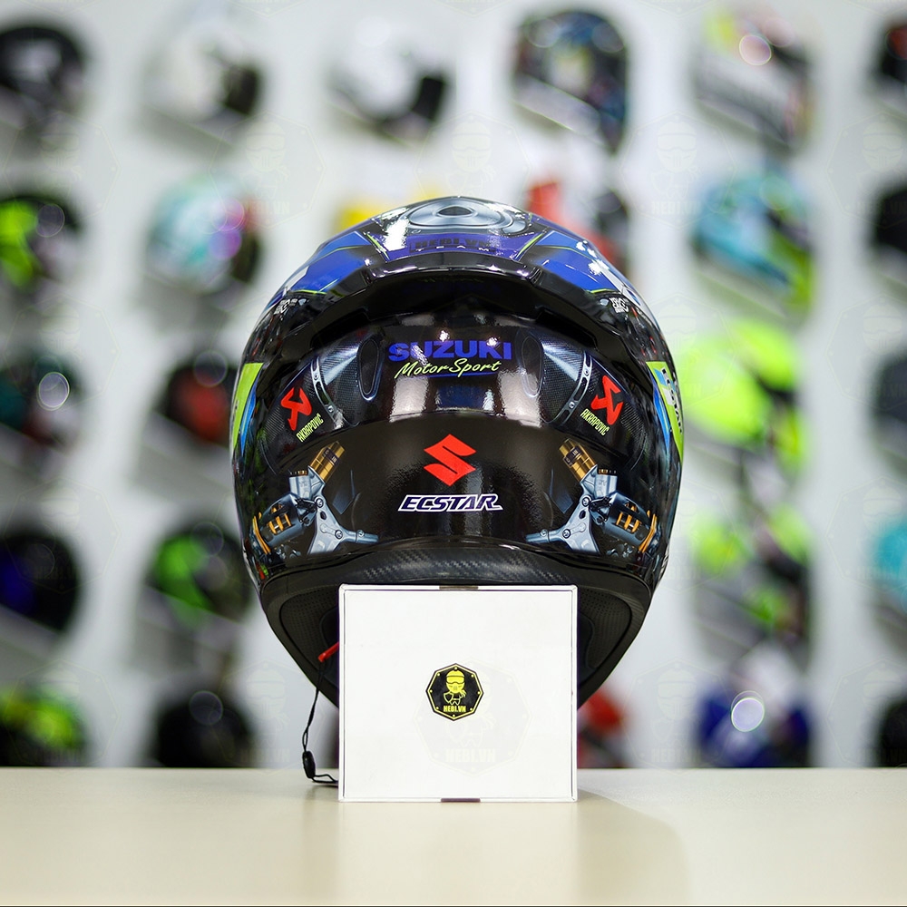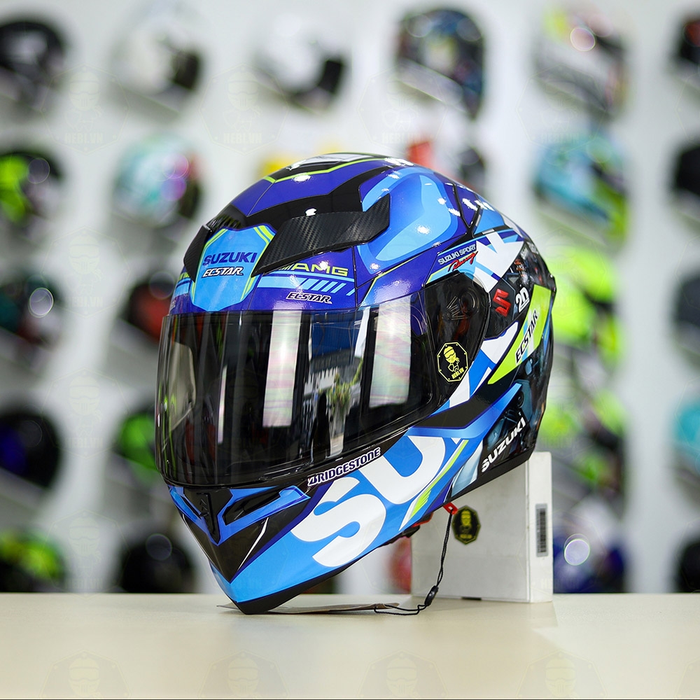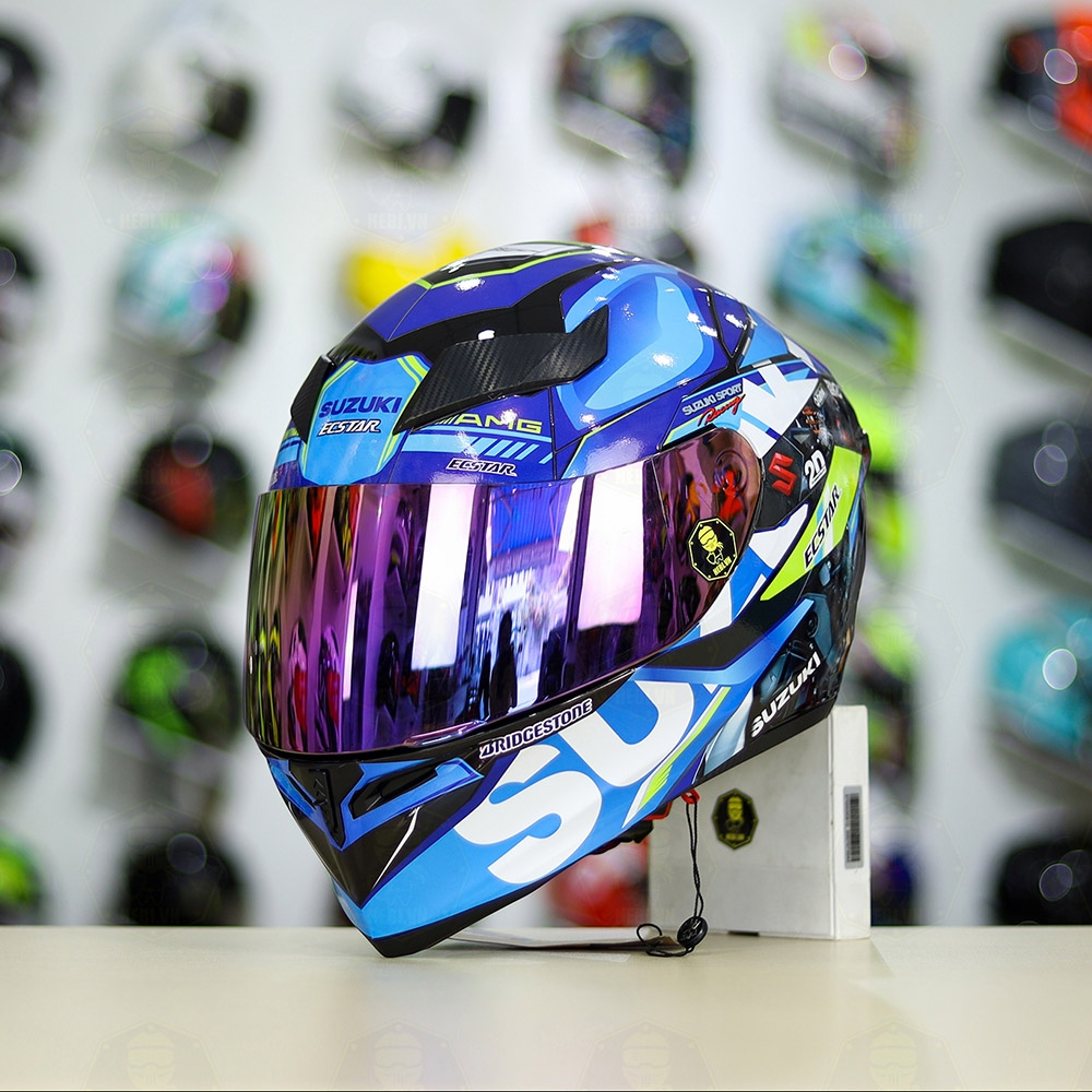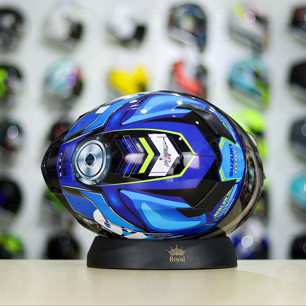 Mũ Royal M138b Đen Bóng + Tem Decal SUZUKI ECSTAR Xanh Trắng Vàng